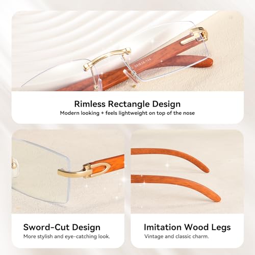 • Lightweight And Durable: The colorful rimless rectangle sunglasses are with the most cutting-edge design style, very lightweight frames, and wood Temples give you a stress-free wearing experience, reinforced metal hinges are designed to prevent the loosening of screws, make the sunglasses more stable, and look more fashionable, High-quality polycarbonate lenses, comfortable silicone nose pads, ultra-light exquisite temples, all the details make it durable, shatterproof, and fashionable