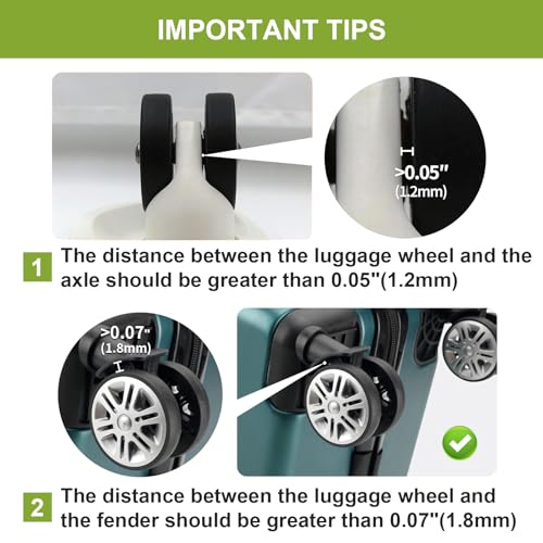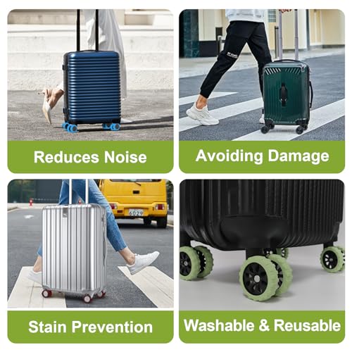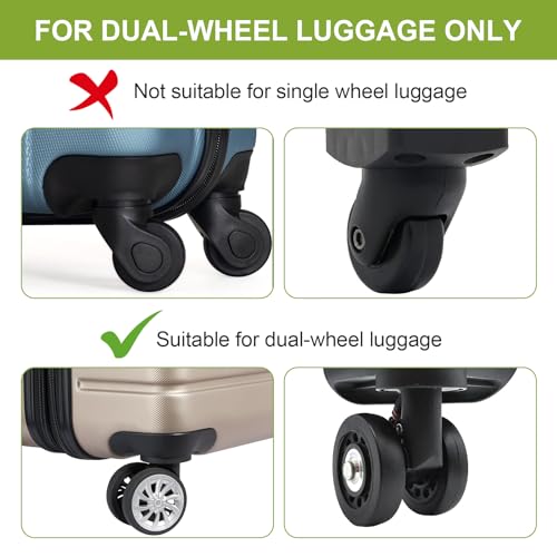 【VERY IMPORTANT】:Rosaerpy Luggage wheels cover are designed specifically for 8-spinner wheels carry on suitcase.Before purchasing, please confirm that your suitcase is double-wheeled, and the size of the wheels and the distance between the wheels and the axles and fenders meet the size requirements described above in our main pictures.【PREVENT DAMAGE】These carry on luggage wheel covers are made of food-grade silicone with a one-of-a-kind serrated pattern, which provides extra protection for the wheels, reduces noise when rolling, protects the hard case luggage wheels from wear and tear on rough surfaces and bumpy roads while traveling, and prevents moisture and other harsh elements.【ANTI-SHEDDING DESIGN】 The suitcase wheel protector has a new upgraded anti-shedding design, like putting armor on your luggage wheels, widening the coverage of the protector, effectively preventing it from falling off when rolling, and the thickened and serrated pattern of the wheel protector is more wear-resistant, which makes your large suitcase last longer and more durable.【FASHIONABLE AND UNIQUE】We offer 6 colors to suit your preference, the bright colors are distinctive and add a personalized logo to your rolling suitcase, making your samsonite luggage easy to spot on the luggage carousel. The caster covers are equally suitable for the office swivel chairs.【EASY TO USE】 Compared to finding and replacing an entire wheel, using spinner luggage wheel covers is very hassle-free. Before purchasing, please confirm that your suitcase is double-wheeled, and the size of the wheels and the distance between the wheels and the axles and fenders meet the size requirements described above in our main picture. They are easy to put on and easy to clean. Using wheel covers to protect and extend the life of your luggage saves both money and hassle. Perfect for everyday use. superior materials and excellent craftsmanship ensure long-lasting durability.