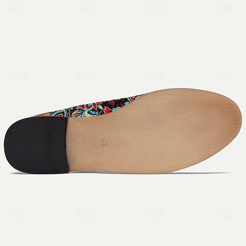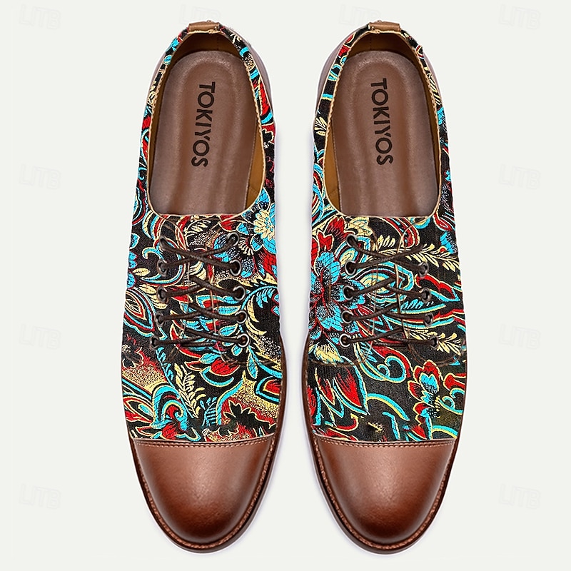 Highlights [Fabric and Material] Crafted from high-quality PU leather and jacquard fabric, these men's Oxford shoes combine durability with a touch of elegance. The rich texture of the jacquard fabric adds an eye-catching detail, complemented by a comfortable and breathable PU lining. [Design and Fit] Featuring a lace-up closure, these shoes provide an adjustable and secure fit. The round toe design ensures ample space and comfort, while the sturdy construction offers slip resistance and long-lasting wear. [Design Highlights] A unique and vibrant paisley pattern in shades of blue, red, and yellow adorns the black background, giving these shoes a standout look. The contrast between the colorful fabric and the brown faux leather toe cap and heel adds a polished finish, perfect for making a bold fashion statement. [Occasions] Ideal for casual outings, these shoes effortlessly blend style and function. Whether you're heading to a dinner with friends or enjoying a relaxed day out, they offer the perfect combination of elegance and comfort. [Size Options] Available in a wide range of sizes, from US6 (EU39/UK5) to US15 (EU48/UK14), these shoes cater to a variety of foot sizes, ensuring a comfortable fit for everyone.