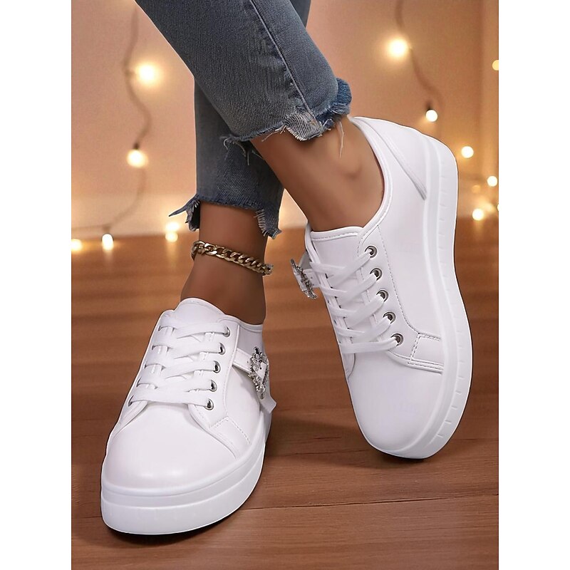 HOT ! Women's Silver Metallic Lace-Up Sneakers with Rhinestone Buckle - Fashion Casual Shoes for Nightlife Parties and Club Outfits