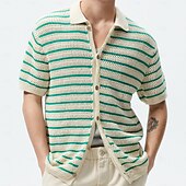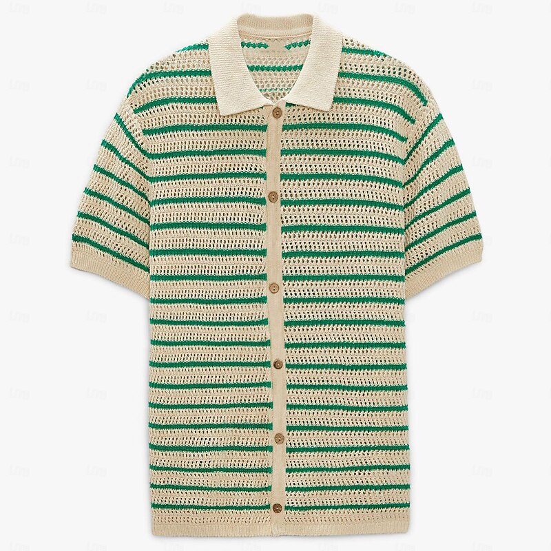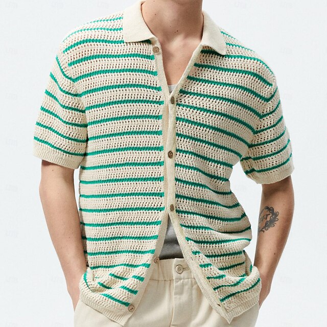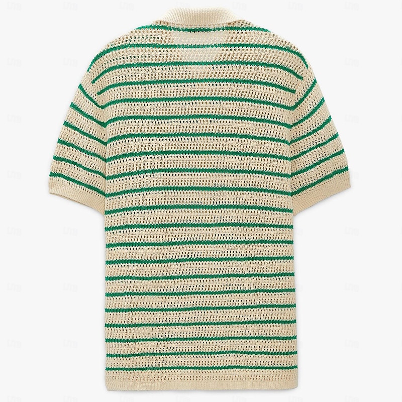 : Crafted from a breathable knit fabric, this men's polo shirt offers a comfortable and soft feel, perfect for the warm summer months. The fabric features a ribbed style with vertical stripes, blending cream and green hues for a refreshing and nautical-inspired look.