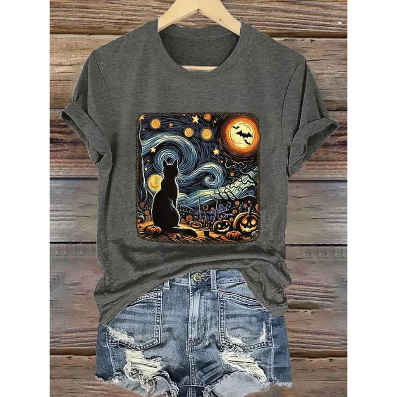 Halloween Women's T shirt Black Cat Graphic Skull Cat Vintage Stylish Classic Short Sleeve Crew Neck Round Neck Regular Tops Daily Weekend Print Black White Blue Orange Gray Summer Fall 11