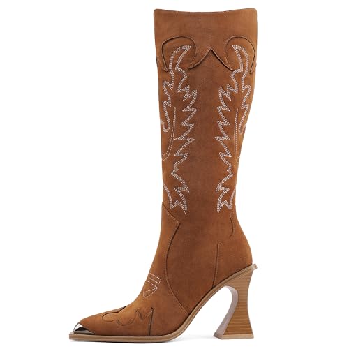 Women's Western Boots Vintage Embroidered Square Toe Cowboy Knee High Boots Brown Leather High Heel Cowgirl Shoes for Country Music Festivals Rodeo Parties and Events 6