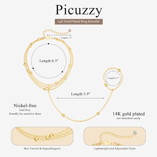 • Gold Bracelets Material: This bracelet ring hand chain is crafted with 14K gold plating and features an upgraded lobster clasp for lasting durability. It resists tarnishing and is hypoallergenic, keeping skin comfortable and eliminating worries about green discoloration