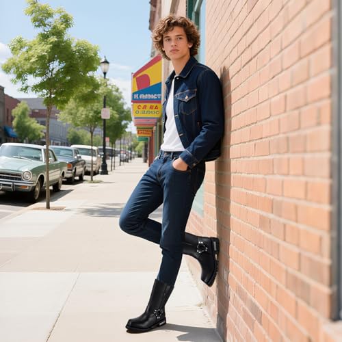 • 【Unique design】This mens PU leather boots have 2 styles: one with side zipper and one without zipper, easy to put on and take off and save your time. Classic harness design, O-ring ankle harness straps, retro will never go out of style. The rounded toe ensures your toes are protected. Go well with jeans, pants.