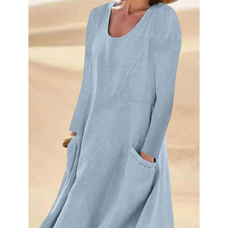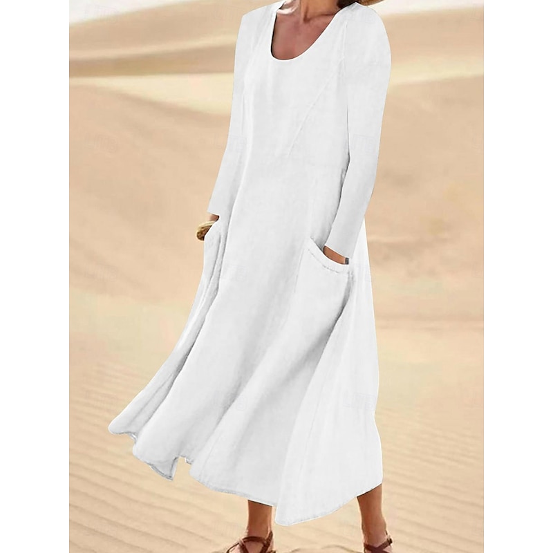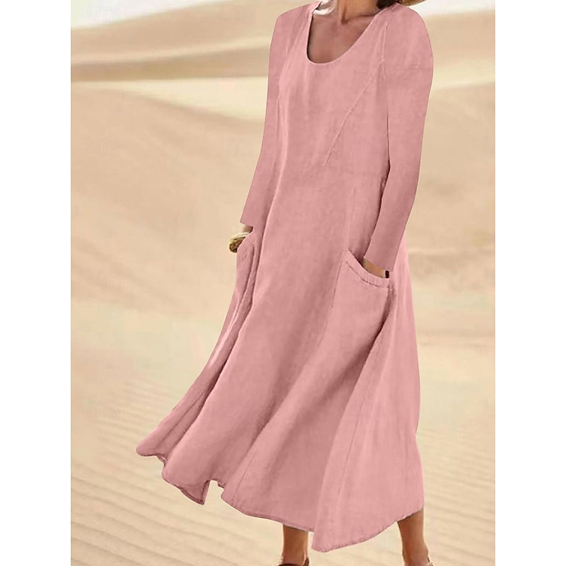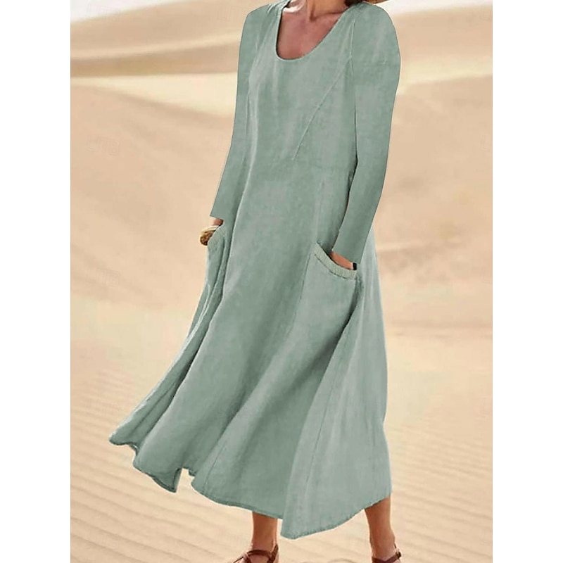 More information about Women's Midi Dress Cotton Linen Dresses Elegant Stylish Basic Vacation Daily Date Loose Fit Plain Long Sleeve Crew Neck White Light Green Pink Sky Blue Spring Fall