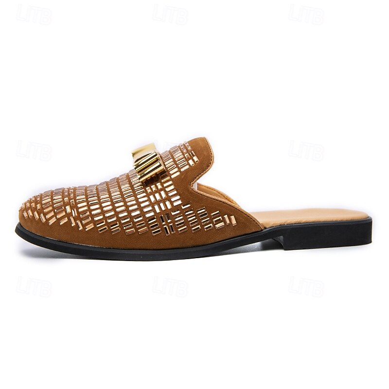 HOT ! Men's Brown Suede Slip-On Mules with Metallic Gold Studded Design and Bow Accent – Stylish Casual Loafers for Everyday Wear and Special Occasions
