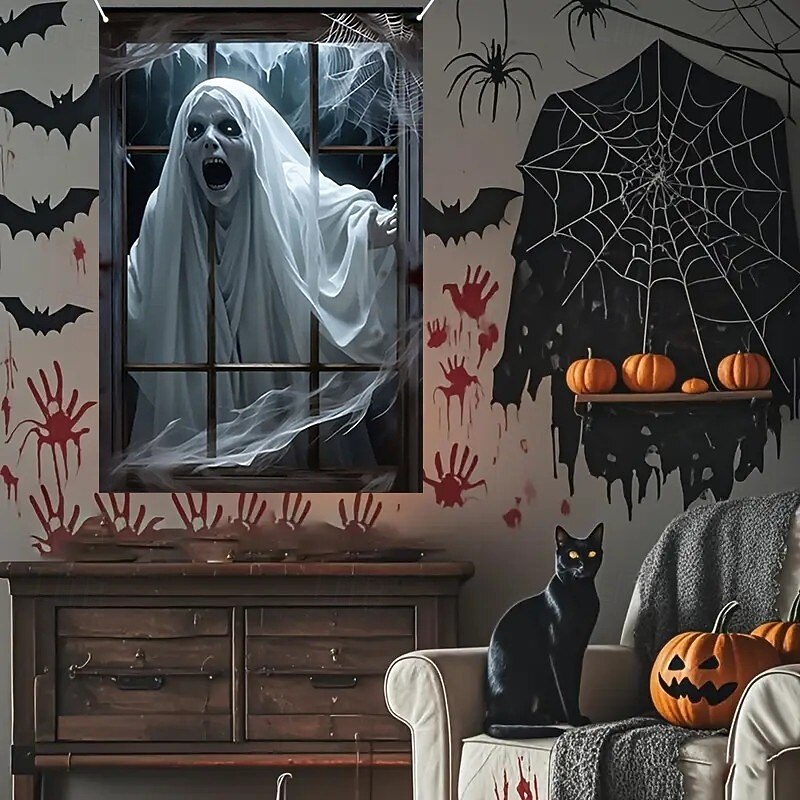 HOT ! Halloween Window Curtain Creepy Ghost Woman Behind Frosted Glass, Horror Door Cover, Window cover, Wall Tapestry for 2025 Halloween Haunted House Spooky Home Decoration