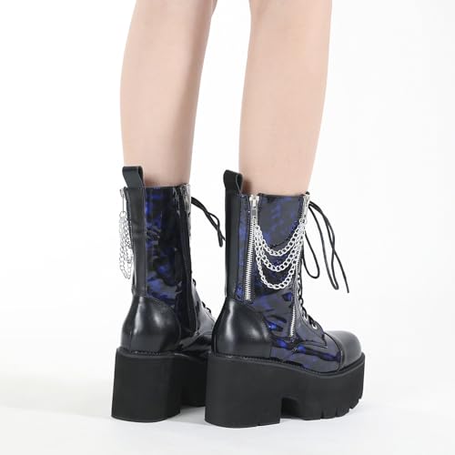 Sole material: RubberOuter material: Faux LeatherClosure type: ZipWater resistance level: Waterproof【Boot Size】The heel of this pair of thick-soled combat ankle boots is about 3.15 inches (8 cm) high. The front heel is about 1.97 inches (5 cm) high. The boot shaft is about 7.08 inches (18 cm) high.【Fashion Design】This women's Gothic mid-calf boots features a round toe design, easily releasing your toes, paired with sexy chains, metal elements and thick heels, fully express yourself. The chic lace-up and side zipper design fits the foot better and is easy to put on and take off.【High-quality materials】Women's Gothic ankle boots are made of high-quality artificial leather, which is soft and delicate, naturally comfortable, breathable and dry. Not only does it show noble texture, but it also ensures comfort and durability of wearing.【Anti-slip Sole】The sole of this sleek patent leather combat ankle boots is made of TPR anti-slip rubber, which is comfortable, wear-resistant and non-slip, and the anti-slip texture of the sole increases the grip of the shoe with the ground, ensuring comfortable wearing for a long time.【Applicable Occasions】Whether it is cool and fashionable or cute and everyday, these women's Gothic ankle boots can show unique charm and match your various outfits. Perfect for role playing, parties, dating, carnivals, concerts, motorcycle riding or outdoor activities in any season. Perfect for everyday use. superior materials and excellent craftsmanship ensure long-lasting durability.