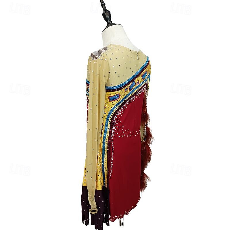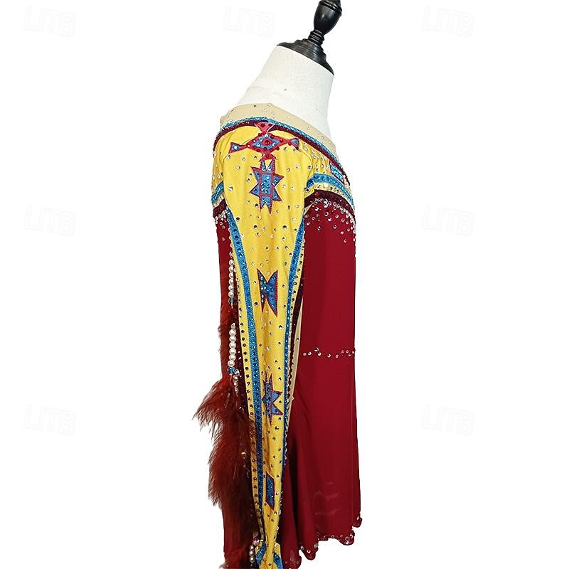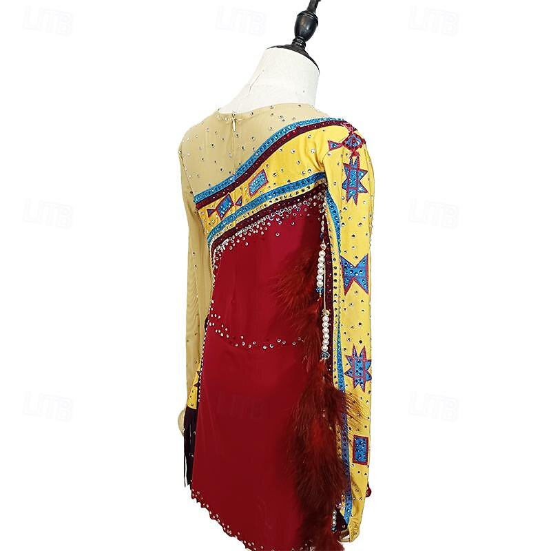 More information about Figure Skating Dress Women's Girls' Ice Skating Dress Red Yellow Patchwork Thumbhole Mesh Spandex Stretchy Training Practice Professional Skating Wear Crystal / Rhinestone Long Sleeve Ice Skating