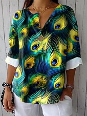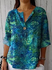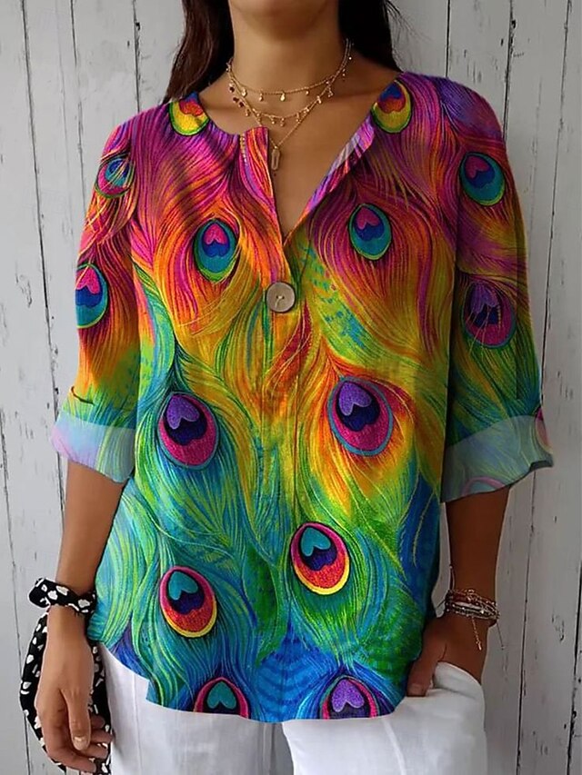 More information about Women's Blouse Graphic Animal Vintage Long Sleeve V Neck Regular Tops Daily Holiday Vacation Wear Patchwork Buttons Print Yellow Blue Green Rainbow Summer Spring