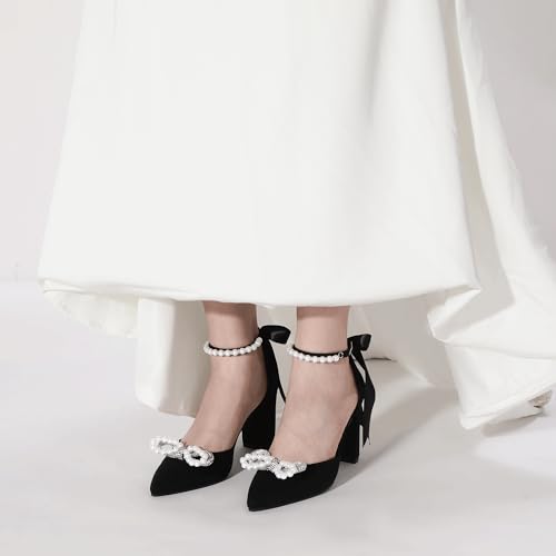 Fabric type: Manmade MaterialSole material: RubberOuter material: Faux LeatherClosure type: Pull-OnElegant Wedding Pumps:This shinny 3.5 inch pointed wedding shoe features a shiny bow toe and eye catching bow tail design, making it the best choice for your wedding, bride, party, and date.Fashion Design:Shining and elegant double layer bow, pearl ankle strap design, elegant and flowing silk bow toe, classic pointed toe, sexy high heels, these exquisite wedding high heels will make you look charming day and night.Outstanding Features:Wedding block shaped heels increase stability and provide a relaxed and comfortable wearing experience. Inlaid pearl ankle strap creates a secure fit, adding a touch of elegance and classic appearance to any occasion. Classic pointed design, can pull up long legs.A Must Have Pumps:Wedding ankle tied high heels and backless silhouette allow you to breathe all day long. Very suitable for shopping, gatherings, weddings, dances, dates, and any other occasion. These wedding heels can be paired with your favorite skirt, jeans, and dress.Comfort and Beauty: The wedding heels with rhinestone decoration are made of soft and comfortable latex insole material, which can maintain the comfort and stability of the feet even if worn for a long time.