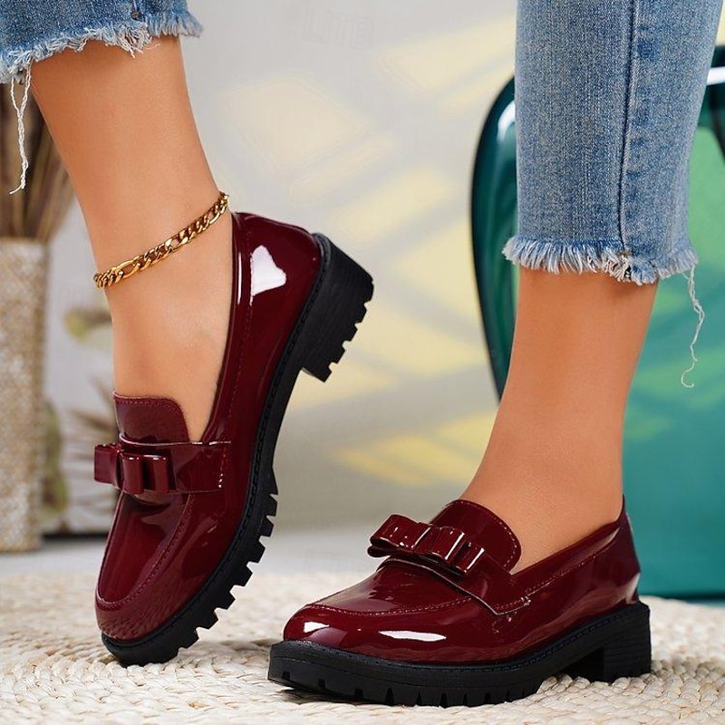 HOT ! Women's Patent Leather Chunky Loafers with Bow Detail – Stylish Casual Slip-On Shoes for Everyday Wear