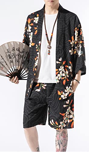 Men's Japanese Style Kimono Tops Shorts Sets Lightweight Casual 3/4 Sleeve Open Front Cardigan Suits 3