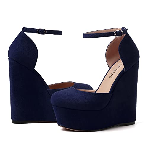 HOT ! WAYDERNS Womens Ankle Strap Buckle Solid Dress Platform Party Round Toe Suede Wedge High Heel Pumps Shoes 6 Inch