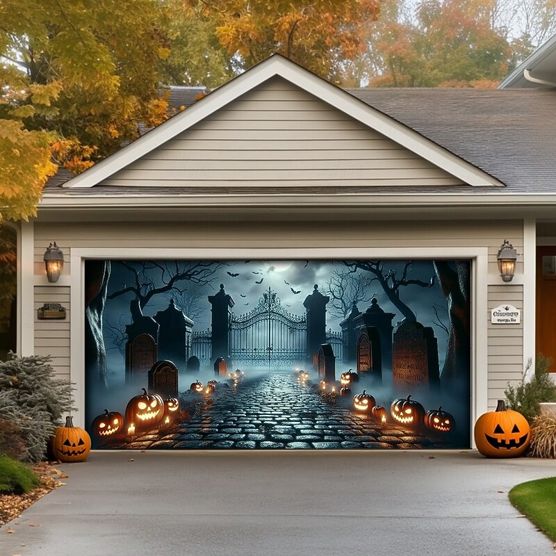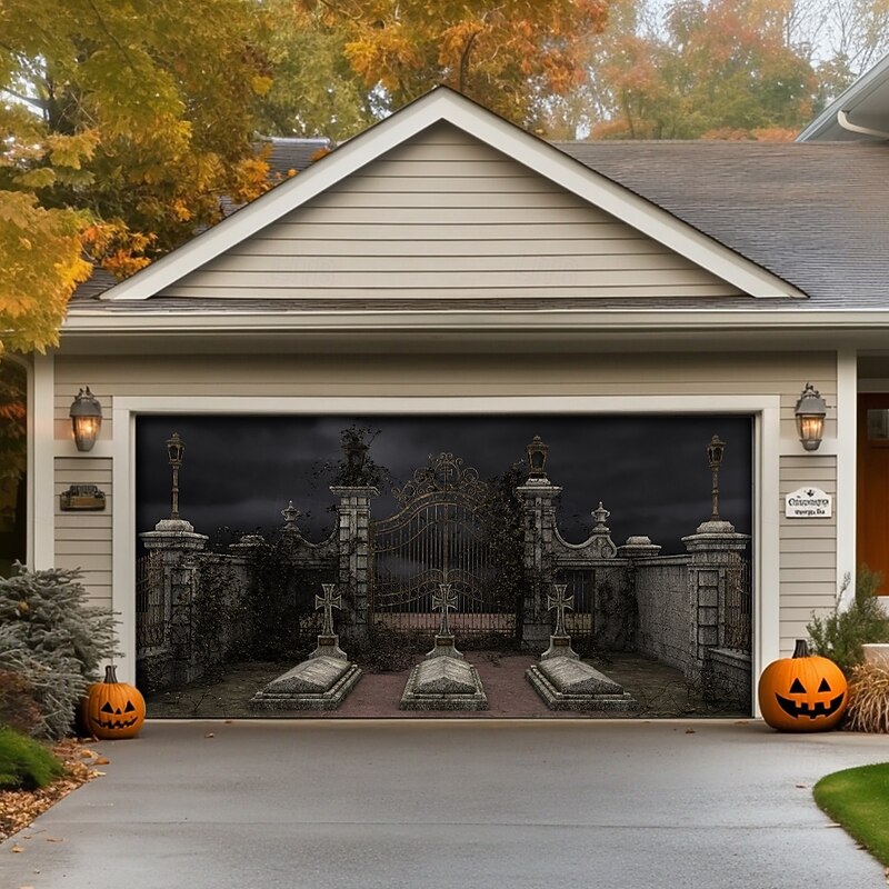 Halloween Garage Door Cover Large Hanging Backdrop Castle 3D Dark Punk Gothic Style Party Outdoor Shooting Backgrounds Front Door Home Decor 10