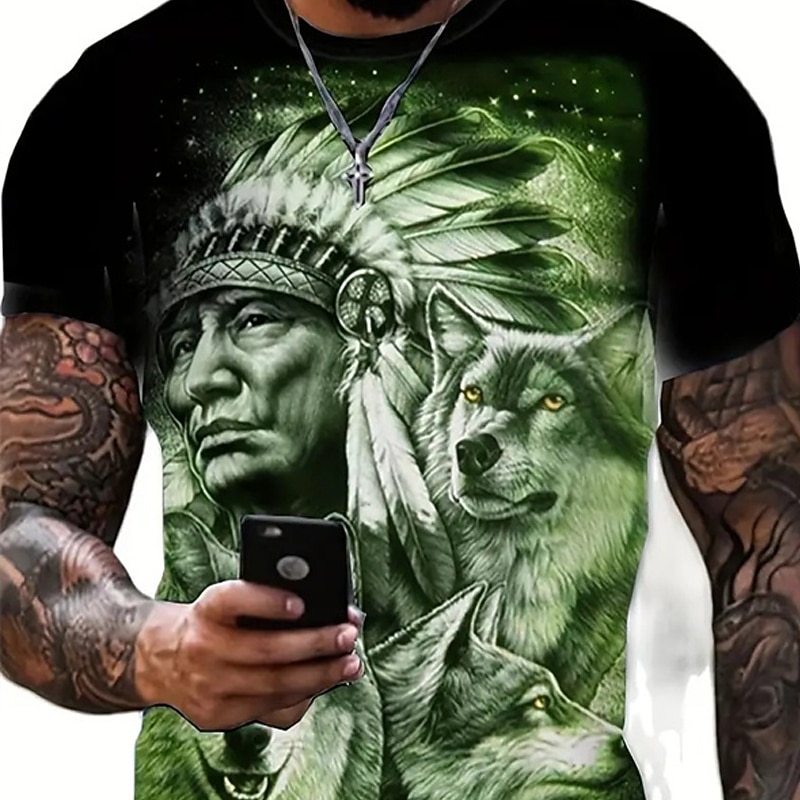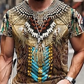 : Showcasing an intricate 3D print inspired by Native American patterns, this T-shirt features vibrant graphics that resemble beadwork, feathers, and traditional motifs. The rich colors, including blue, brown, green, dark blue, and purple, create a bold visual impact, making it a standout piece in any casual outfit. The classic crew neck and short sleeves complete its vintage and designer appeal.