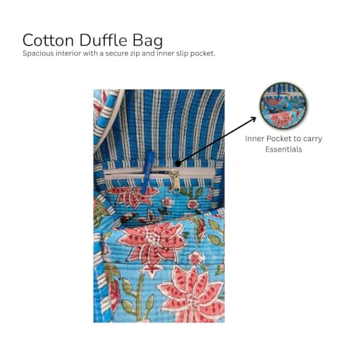 • Handmade Quilted Floral Design – Crafted from 100% cotton fabric with beautiful hand block-printed floral patterns, this duffel bag adds a touch of ethnic charm and bohemian flair to your travel essentials.