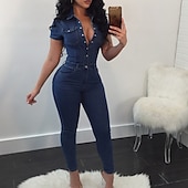 Highlights [Fabric and Fit:] Crafted from high-quality denim, this women's jumpsuit offers a comfortable yet stylish fit. The fabric's stretchability makes it perfect for achieving a flattering silhouette, with a high-rise waist that enhances your form. The jumpsuit is designed for a regular fit, providing both comfort and style for daily wear. [Design Highlights:] This jumpsuit features a classic shirt collar and a button-down front, blending timeless elegance with modern streetwear flair. The short sleeves are ideal for spring and summer, while the deep blue shade adds a touch of sophistication. Front and back pockets enhance its practicality, making it a versatile addition to your wardrobe. [Occasions:] Versatile enough for a variety of occasions, this jumpsuit suits everything from casual street outings to vacations and daily activities. Its chic design allows you to dress it up for going out or keep it laid-back for a more casual look. [Size Range:] Available in sizes S, M, L, this jumpsuit caters to a range of body types, ensuring a comfortable and tailored fit for every wearer.