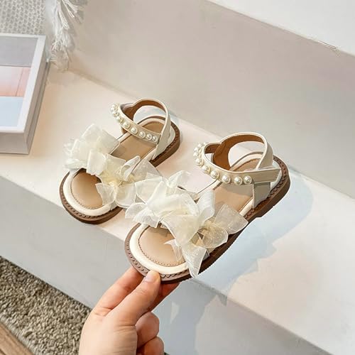 Girls Summer Sandals Mesh Pearl Beaded Ankle Strap Soft Sole Flats Open Toe Bow Flower Pump Dress Wedding Shoes 5