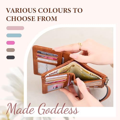 Womens Wallet, Leather RFID Blocking Bifold Zipper Pocket Wallet Card Case Purse with ID Window (Brown)