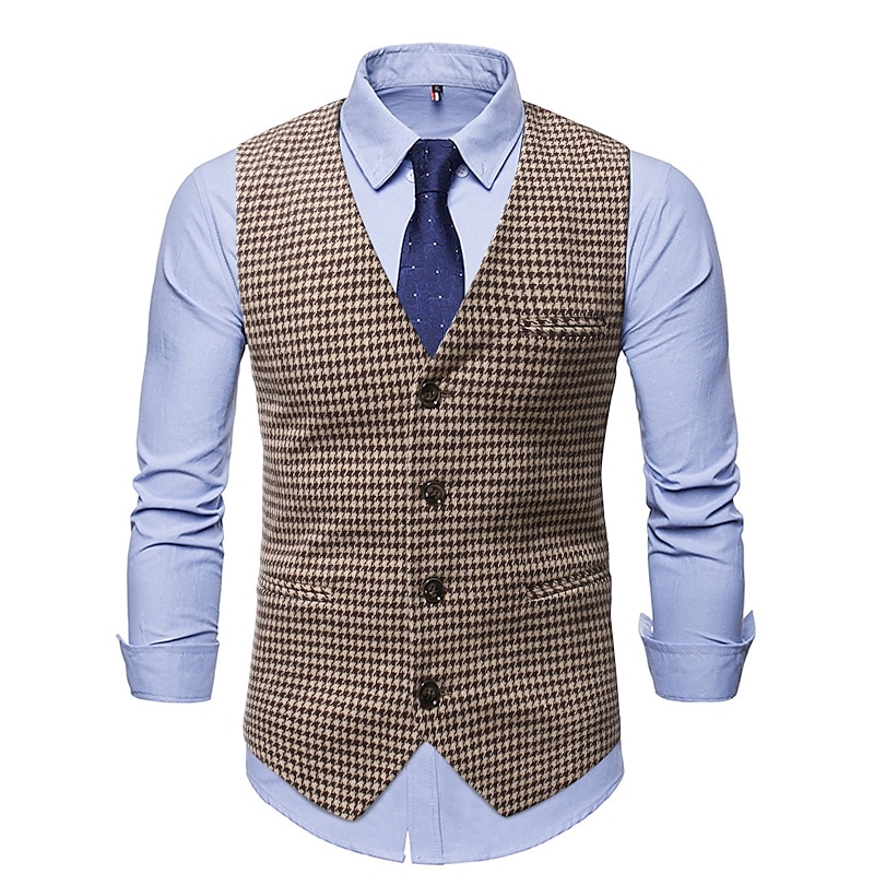 More information about Men's Vest Waistcoat Wedding Daily Streetwear Business Fall Winter Print Polyester Breathable Houndstooth Single Breasted Turndown Regular Fit Black Coffee Vest