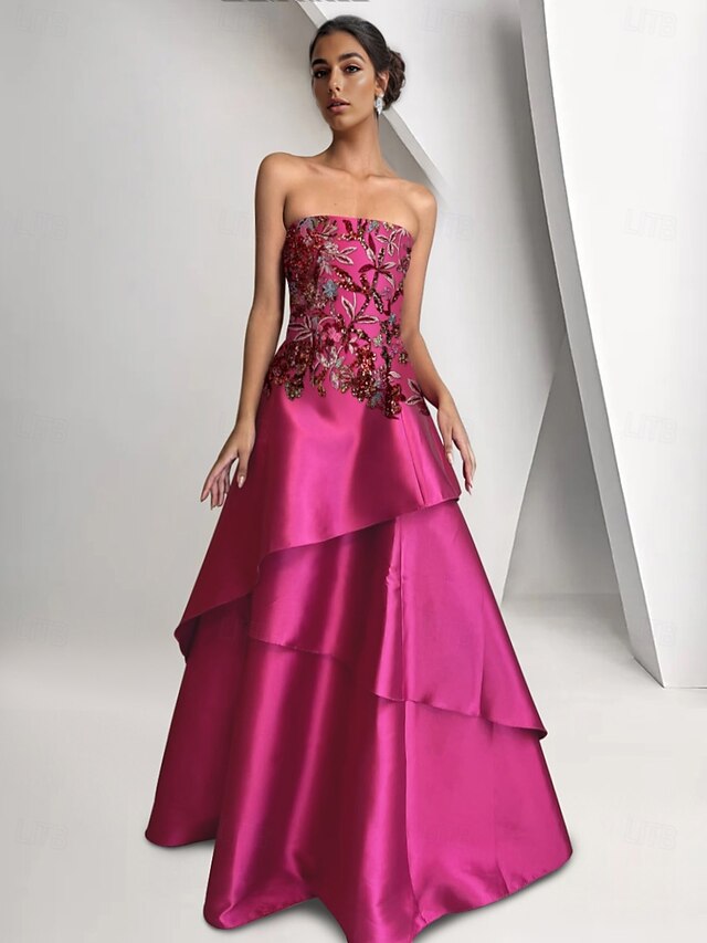 Beaded Gown Dropped Waist A-Line Evening Gown Asymmetrical Tiered Dress Formal Semi Formal Wedding Floor Length Sleeveless Satin 1