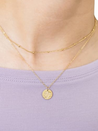 Birth Flower Necklace, Gold Layered Necklaces for Women, Birth Month Flower Coin Pendant Necklace Set, Satellite Chain, Birthday Gifts