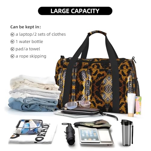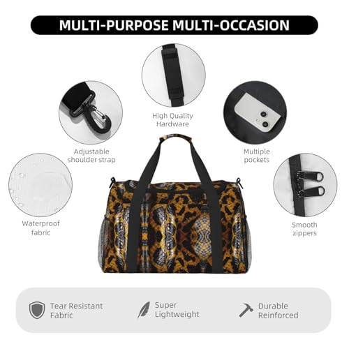 Enduring Material: Yellow Snake print Carry On Bag is fashioned with solid twill, meeting the demands of travel. The resilient nylon zippers and pulls ensure smooth operation, making it a trustworthy companion for your trips.Pain Alleviator: Yellow Snake print Travel Essentials Duffle Bag is equipped with thin pit webbing for better firmness and aesthetics. The handle safeguard lessens hand ache, being a superb asset for short trips and travels.Big Storage: Yellow Snake print Carry On Bag sized 19.6x13x10.2 inches features a vast capacity. It can swallow up numerous items like travel documents, clothing pieces, and more, ensuring sufficient space for travel.Scene Shifter: Yellow Snake print Travel Bag shifts gears from being a flight-friendly travel essential to a versatile bag for weekend outings and sporting escapades. It blends functionality and style, making it suitable for various scenarios, from airport terminals to hiking trails.Accessory Assembly: Yellow Snake print Weekender Bags for Women contains a main storage with double-ended zippers. It has a built-in zip compartment, an adaptable strap, hand-carrying handles, and side features like mesh pouches and reinforced bands, meeting travel needs.