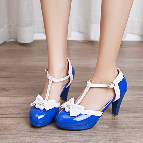 SHEMEE Women's Patent Leather T-Strap Mary Jane Pumps Chunky High Heel Platform Ankle Strap Buckle Round Toe Cute Bow Kawaii Cosplay Shoes 7
