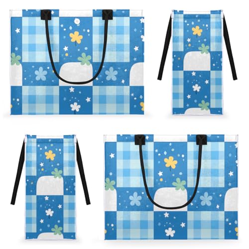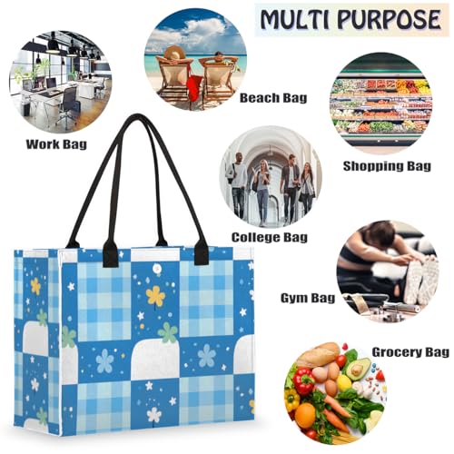 HOT ! Blue Flowers Plaid Tote Bag for Women Large Beach Bag Reusable Tote Bags for Work Travel Beach Shopping