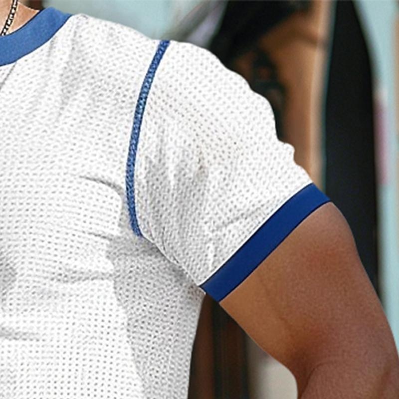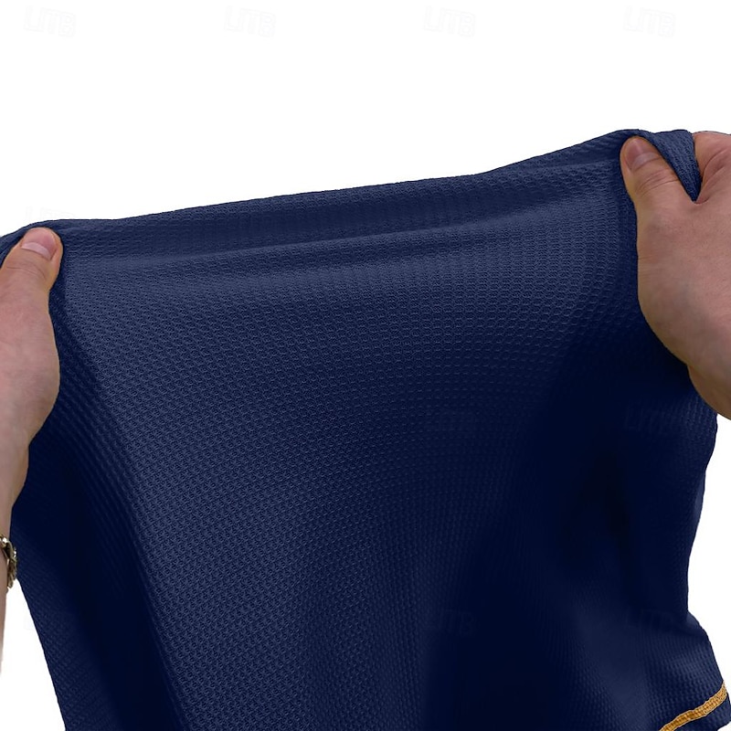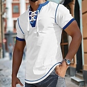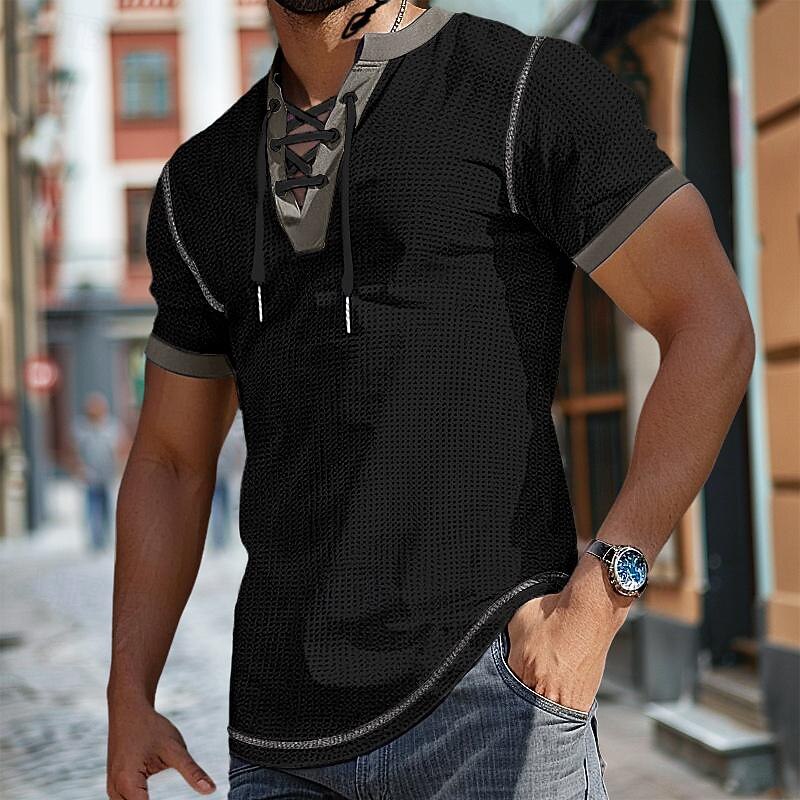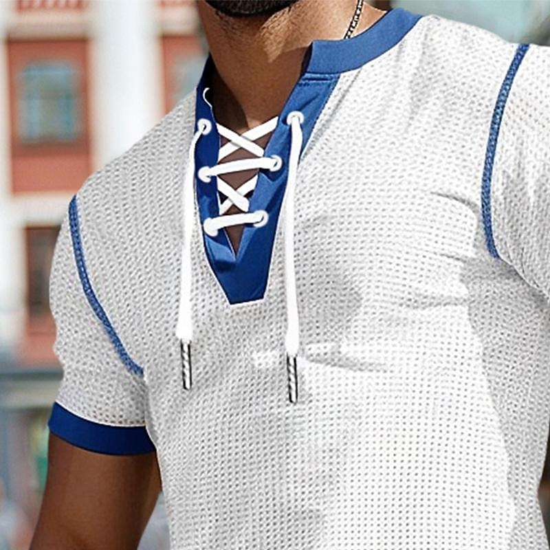 Highlights [Fabric] : Crafted from a high-quality polyester and waffle fabric blend, this men's T-shirt provides a breathable and micro-elastic wear, making it perfect for daily comfort. [Fit] : The short sleeves are designed for a snug fit around the arms, enhancing an athletic and modern silhouette. The Henley shirt cut offers a relaxed and stylish fit suitable for casual wear. [Design Highlights] : Featuring a distinctive lace-up V-neck, this shirt adds a trendy twist to the classic Henley style, while the patchwork accents in navy blue and mustard yellow contribute to its sophisticated look. This design element also offers adjustability for comfort and fashion versatility. [Occasions] : Perfect for summer outings, this shirt is suitable for a variety of settings such as outdoor adventures, streetwear, and casual gatherings. Whether for a laid-back day out or an informal occasion, the T-shirt is versatile enough to fit into any scenario. [Size Range] : Available in a range of sizes from S to XXXL, ensuring a suitable fit for different body types and preferences.