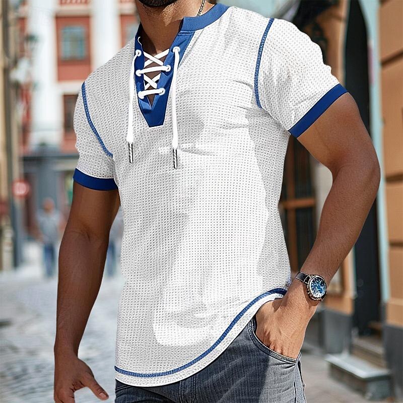 HOT ! Men's Waffle Henley Shirt Henley Shirt Short Sleeve Shirt Tee Top Short Sleeve V Neck Summer Patchwork Daily Hawaiian Lace up Drawstring Outdoor Street Causal White Black Navy Blue Top Tee for Men