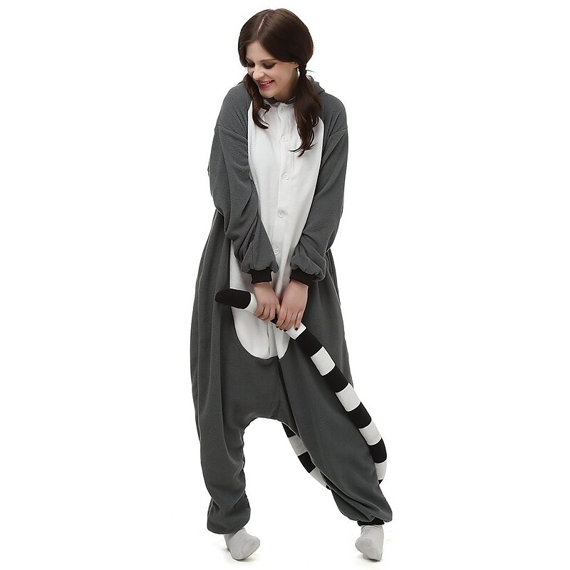 Highlights [Fabric] : Crafted from plush flannel material, this adults' animal onesie provides a cozy, soft, and warm feel. The fabric is stretchy, allowing for comfort and ease of movement during wear. [Fit] : Designed in a relaxed fit, this onesie ensures ultimate comfort and freedom of motion, making it ideal for both lounging at home and lively costume events. [Design Highlights] : Featuring a charming lemur theme, the onesie includes a hood styled with a lemur's face, complete with ears and embroidered details, adding a whimsical touch. A prominent black and white striped tail is attached at the back. The body is primarily grey with a contrasting white belly, and elastic cuffs at the wrists and ankles ensure a snug fit. [Occasions] : Perfect for Christmas celebrations, carnival events, and costume parties. This funny and cute onesie also serves as unique loungewear for animal lovers. [Size Notice] : Available in sizes S, M, L, and XL, accommodating a range of adult body types for both men and women.