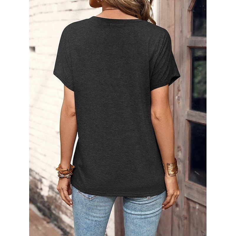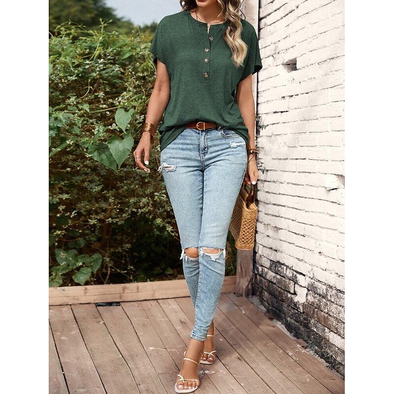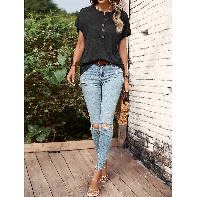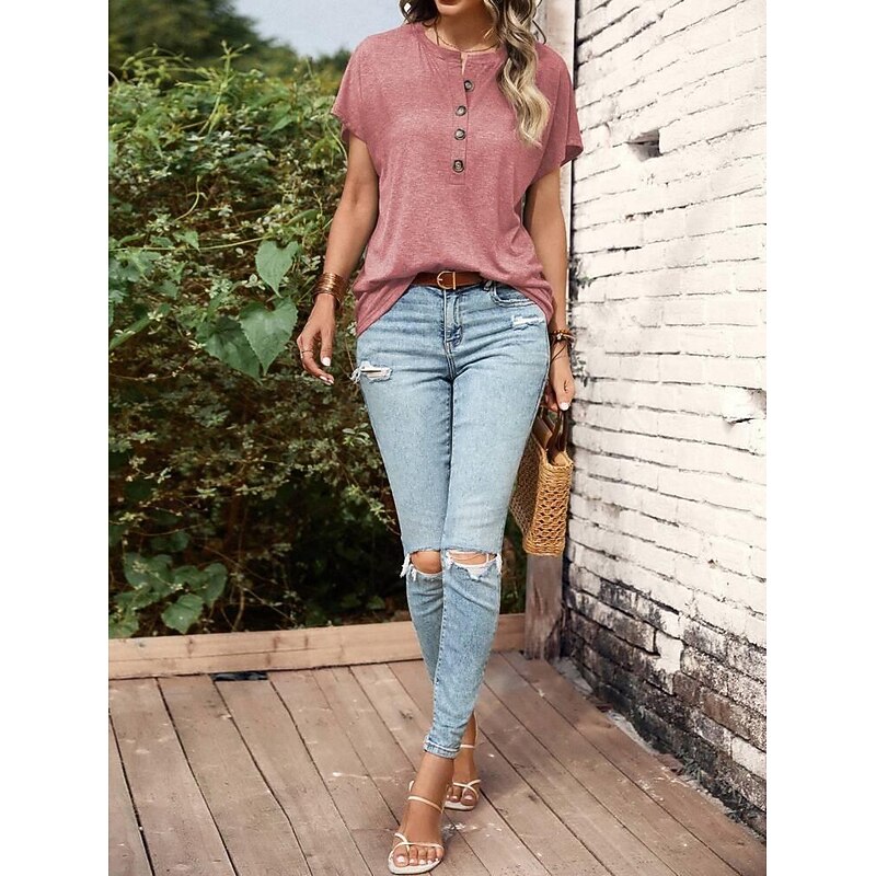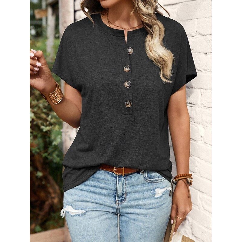 HOT ! Women's T Shirt Plain Fashion Short Sleeve Round Neck Regular Tops Daily Weekend Buttons Black Pink Blue Brown Green Summer