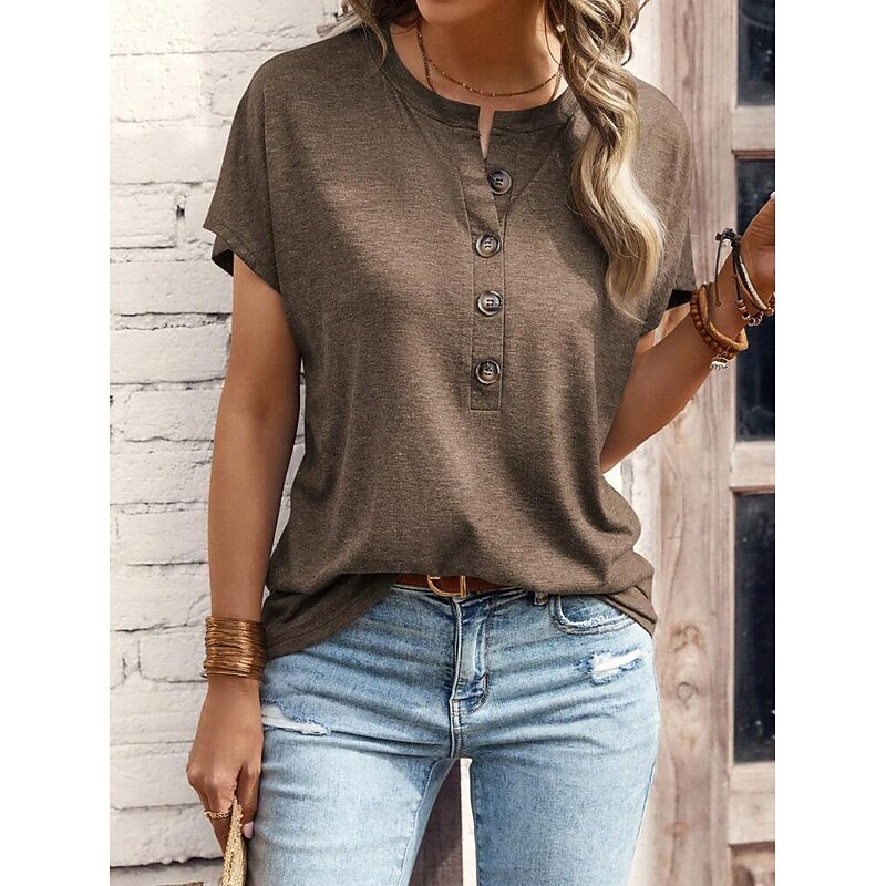 Highlights [Fabric] : Crafted from a lightweight polyester blend, this women's T-shirt ensures breathability and comfort, making it ideal for summer wear. The fabric's micro-elastic properties provide a slight stretch for ease of movement. [Fit] : The shirt features a regular fit, offering a comfortable and relaxed silhouette. The short sleeves are designed for freedom of movement, making this top a versatile addition to any casual wardrobe. [Design Highlights] : This T-shirt showcases a classic round neckline paired with a chic button-up front. The four decorative buttons add a touch of elegance to the otherwise simple design. It comes in a variety of colors including blue, brown, green, black, pink, and khaki, allowing for diverse styling options. [Occasions] : Perfect for daily wear and weekend outings, this T-shirt pairs effortlessly with jeans or shorts for a laid-back yet stylish look. Its simplicity and versatility make it suitable for casual outings and relaxed social events. [Size Range] : Available in sizes S, M, L, XL, and 2XL, this top caters to a wide range of body types, ensuring a comfortable fit for everyone.