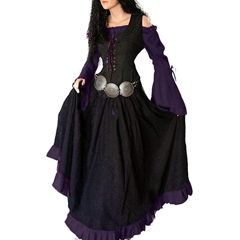 Highlights Style: long flare sleeve,floor length, off Shoulder, elastic waist, comfortable, medieval long dress for women, vintage masquerade Party Dress. Feature: elasticized neckline and sorceress sleeves. Irish over costumes dress with lovely trim. Occasion: great for medieval weddings, cosplay, Halloween, renaissance festival, theme party, etc.