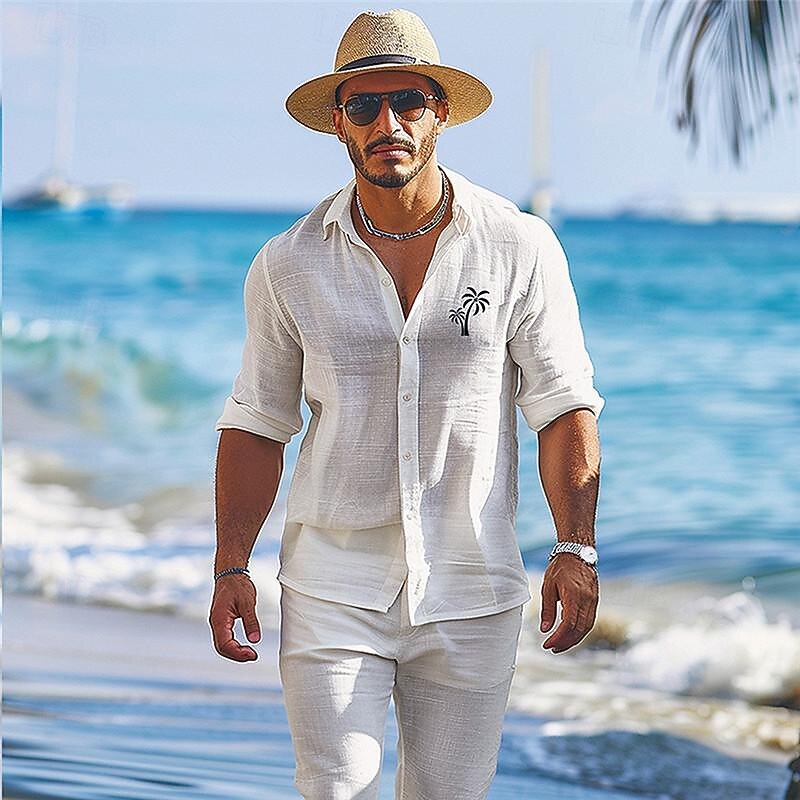Highlights [Fabric] : Crafted from breathable linen fabric, this men's shirt offers lightweight comfort, making it perfect for warm-weather wear. The linen material provides a micro-elastic fit that ensures both ease of movement and style throughout the spring and summer seasons. [Style] : The shirt boasts a classic button-down turndown collar design, allowing for a versatile regular fit. It can be worn buttoned up for a more polished look or left slightly open for a relaxed beach vibe. [Design Highlights] : Featuring a subtle palm tree pattern, this shirt embodies tropical charm. The long sleeves can be rolled up for added comfort and casual style. Its neutral color palette of blue and white ensures easy pairing with a variety of bottoms. [Occasion] : Ideal for vacations, holidays, and beach outings, this shirt complements a carefree, resort-style wardrobe. Suitable for both casual and semi-formal occasions, it offers a harmonious blend of style and functionality. [Size Range] : Available in a wide size range including S, M, L, XL, 2XL, and 3XL, this shirt caters to diverse body types, ensuring a comfortable fit for adults across different preferences and needs.