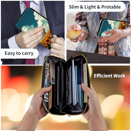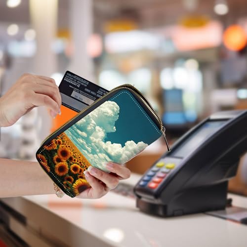 Brand: smauncucnColor: Sunflower Field and Clouds-7-661Material: LeatherPattern: Sunflower Field and CloudsSpecial Feature: Card Holder, Coin Slot, Expandable, Photo & ID Holder, RFID Protected【Capacity】Zip-around design with 12 card slots, 3 full-length compartments, 1 spacious zippered pocket, and detachable wrist strap. Perfectly organizes phones , cables, cash, cards, keys, and coins — your ultimate travel essentials organizer.【Dimensions】Measures 7.8×4.1×1 with 7.56 adjustable wristlet strap for universal comfort (fits EU/US women's wrists). Securely wear as a crossbody purse or tuck into backpacks/bags. Ideal for shopping, work, travel, and daily adventures.【RFID Protection】This wallet is equipped with advanced RFID blocking technology, ensuring robust protection for your valuable personal information stored on RFID chips, safeguarding your privacy at all times.【REFINED MATERIAL】This wallet is made of PU leather. The leather is plush and smooth, making the credit card wallet less prone to dirt. It is equipped with a sturdy and durable zipper and hand-stitched edges, ensuring long-term durability and a stable structure.【Practical Credit Card Fixture】Equipped with a detachable wristband for easy carrying; Its elegant and retro design is suitable for various occasions, such as traveling, business trips, dates, shopping and parties, etc. Perfect for everyday use. excellent materials and excellent craftsmanship ensure long-lasting durability.