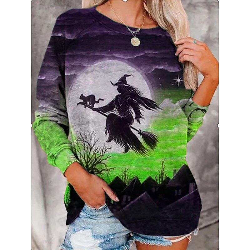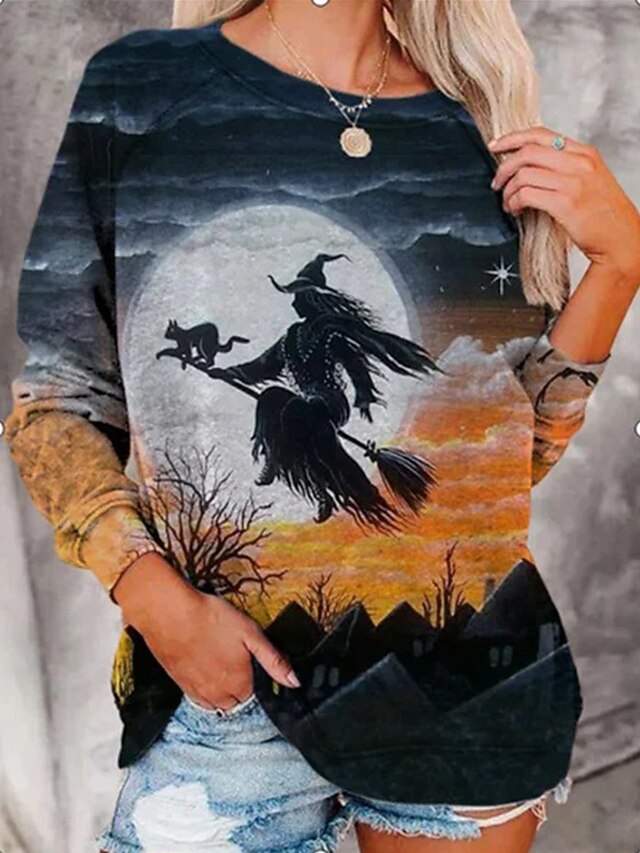 More information about Halloween Women's Sweatshirts Witch Graphic Fashion Casual Long Sleeve Crew Neck Regular Tops Casual Print Blue Purple Orange Summer Spring Fall
