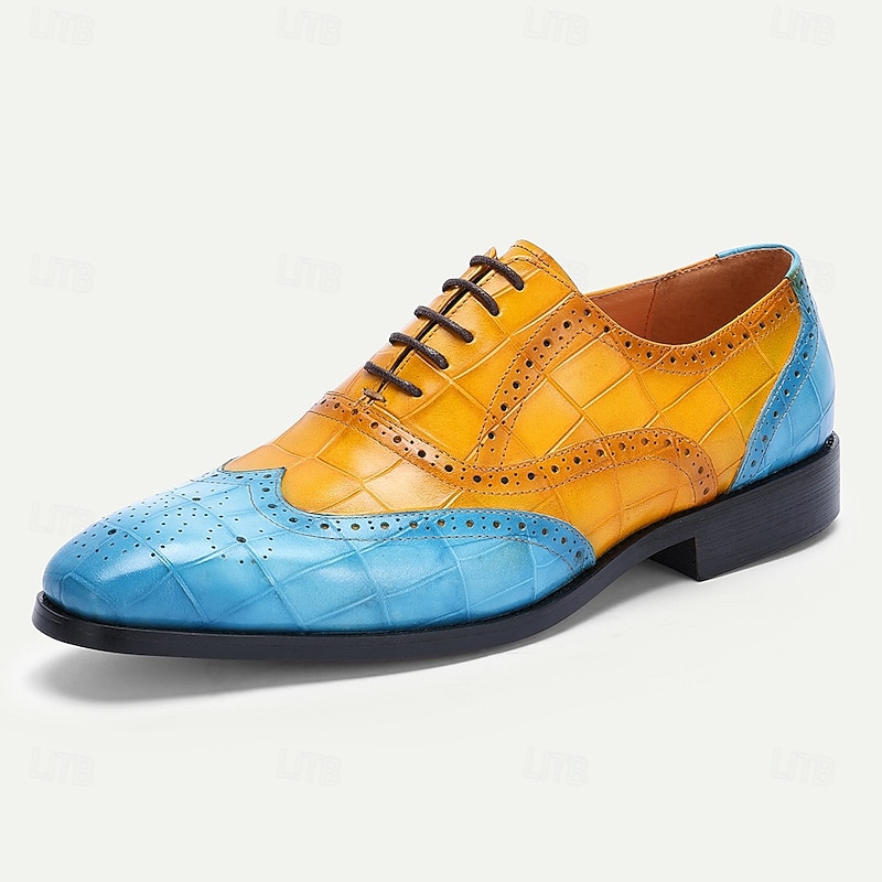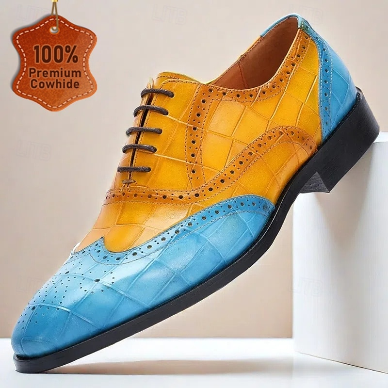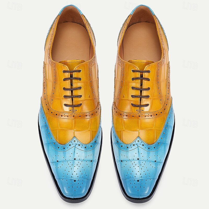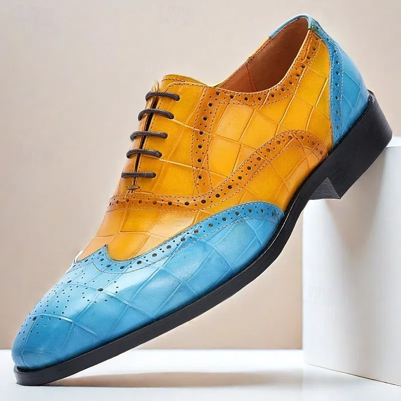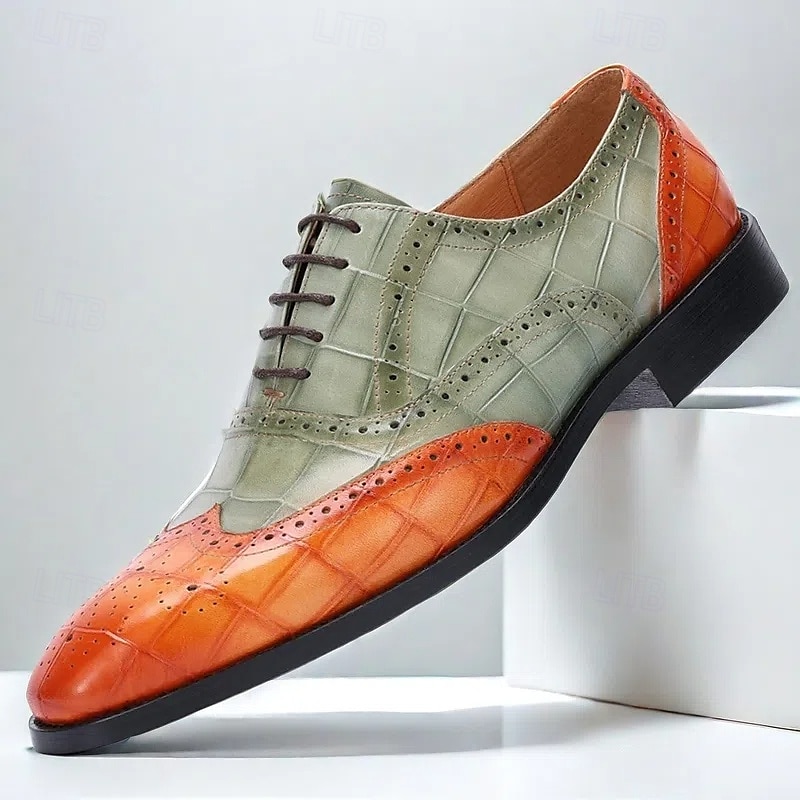 HOT ! Men's Green and Orange Wingtip Oxford Shoes – Premium Cowhide Leather, Crocodile Embossed Pattern, Brogue Detailing, Elegant Formal Footwear for Weddings and Business Events