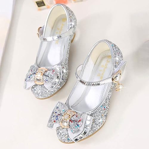HOT ! Yoawdats Girls Toddler Dress Shoes Sparkly Ruby Bowkno Flowert Wedding Party Bridesmaids Low Heel Princess Shoes for Kids (Silver, 18.2 cm)