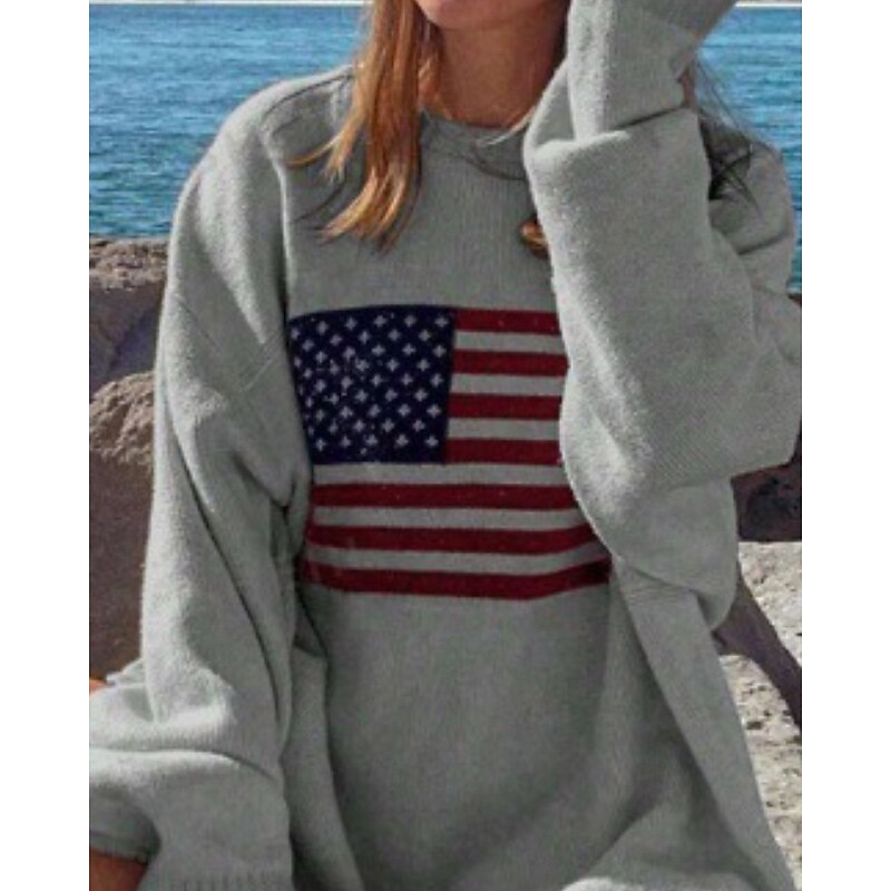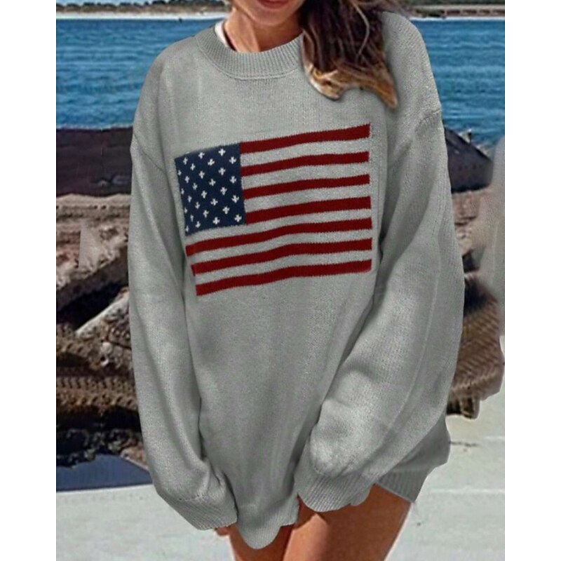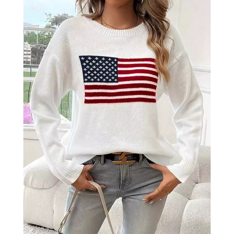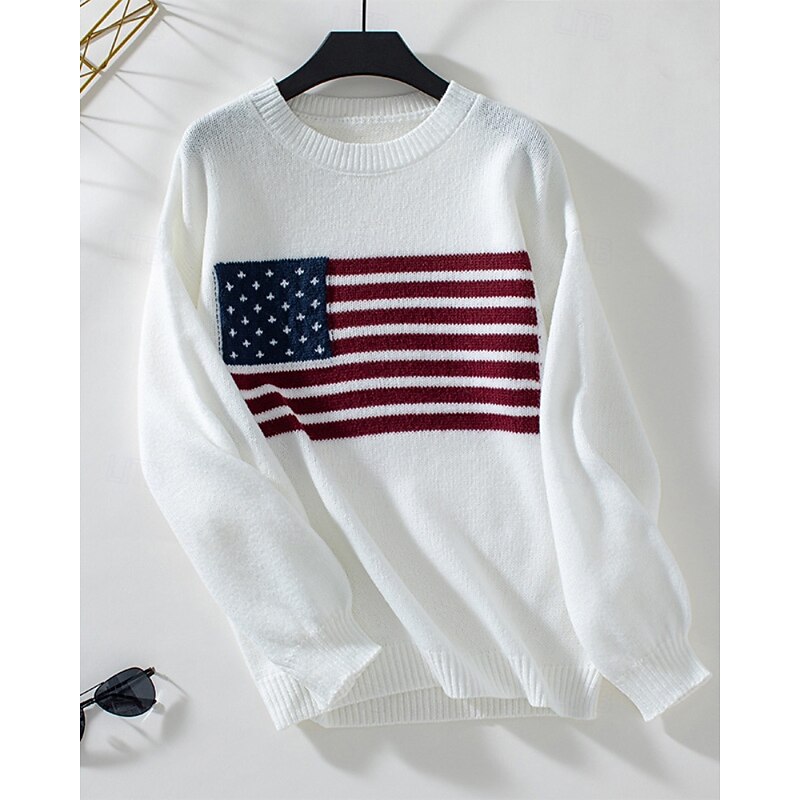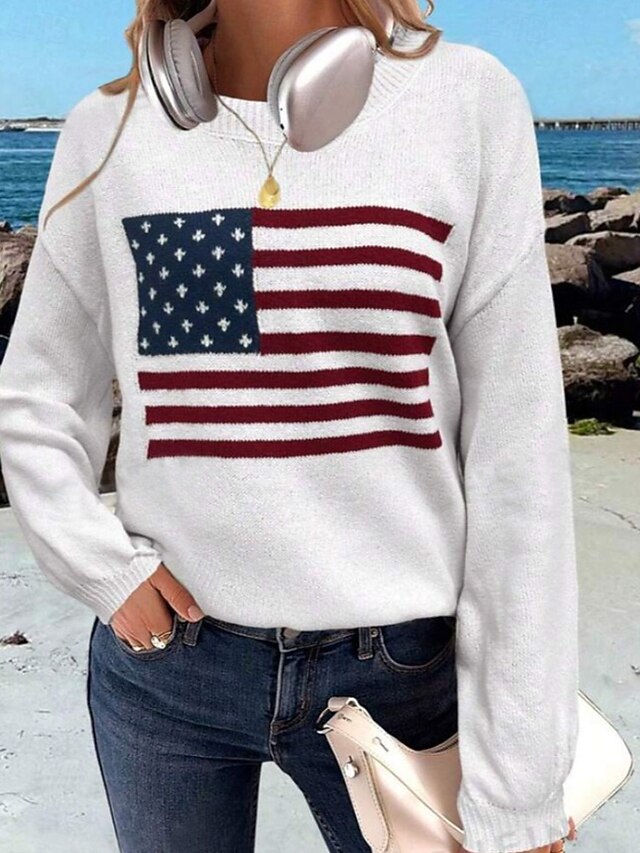 HOT ! Women's Sweater Pullover Casual Star Striped Ribbed Crew Neck Knitted Print Long Sleeve Regular Tops Knit Outdoor Holiday Weekend White Gray Winter