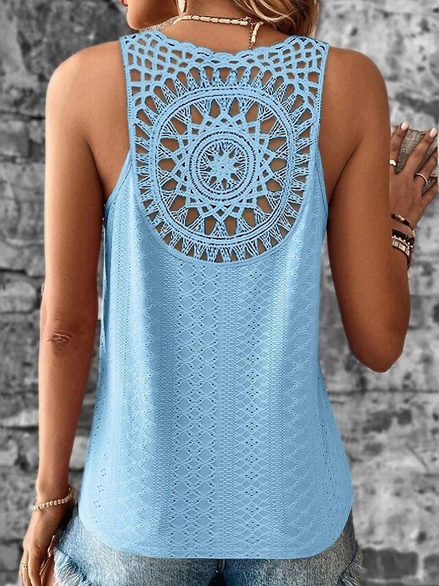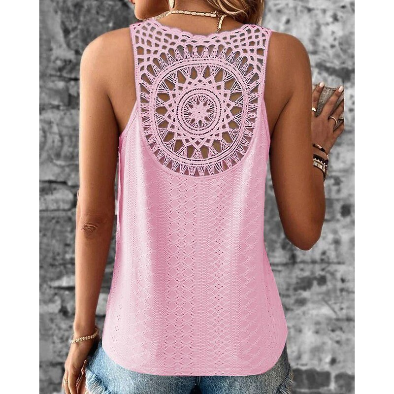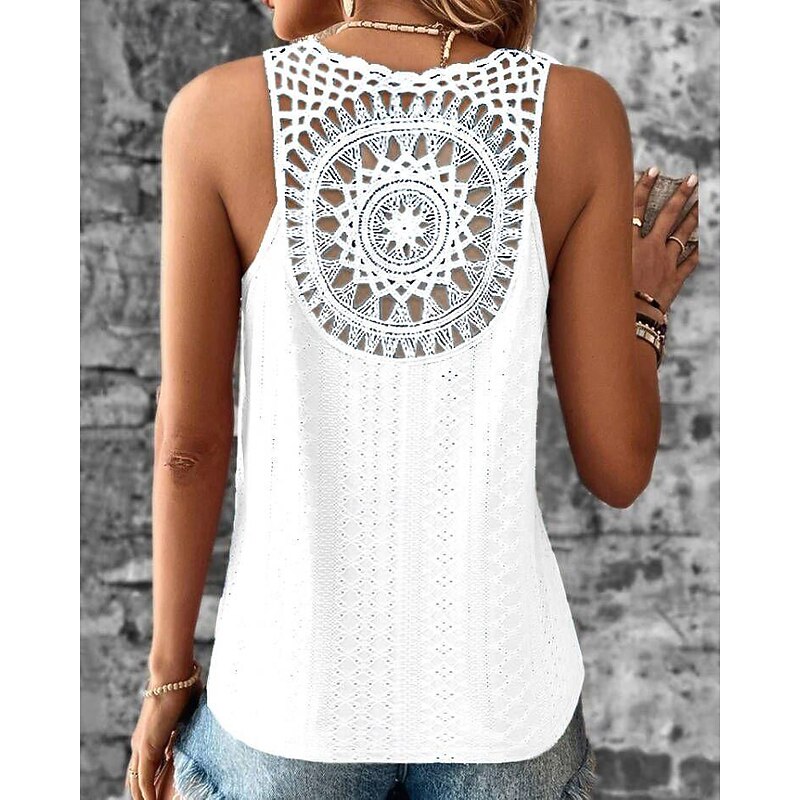Highlights [Fabric] : Crafted from lightweight and breathable polyester, this sleeveless top offers a soft, comfortable feel perfect for summer. The material's micro-elastic quality ensures ease of movement while maintaining its stylish shape. [Fit] : Featuring a regular fit, this top is designed to provide a relaxed yet chic silhouette suitable for casual outings. Its sleeveless design enhances comfort, making it an ideal choice for warm weather. [Design Highlights] : The top boasts a unique cut-out design with an intricate crochet pattern on the back, forming a circular motif that adds an artistic and bohemian flair. The V-neckline complements the overall look, creating a balance of fashion and femininity. [Occasions] : Perfect for a variety of occasions, this top transitions seamlessly from street style to daily casual wear. Whether you're spending a day out shopping or enjoying a weekend brunch, it pairs effortlessly with jeans or shorts for a laid-back, chic look. [Size Range] : Available in a wide range of sizes from S to XXL, this top accommodates various body types, offering a comfortable and flattering fit for all.