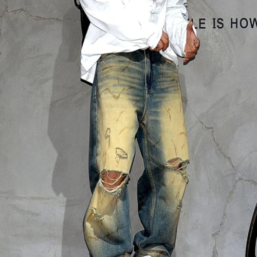 Men’S Vintage Hip Hop Straight Fit Ripped Baggy Distressed Denim Trousers Button Fly Fashion Streetwear Pants