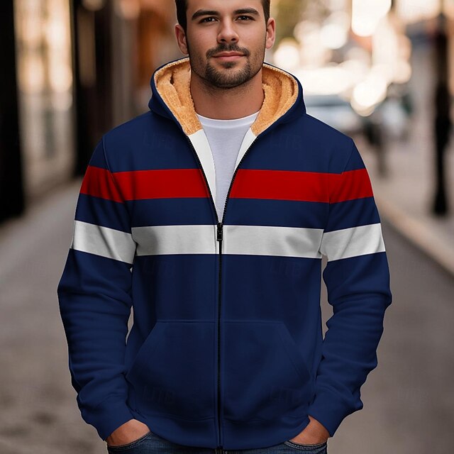 More information about Men's Color Block Fleece Hoodies Fashion Cool Long Sleeve Hooded Holiday Streetwear Black Blue Zipper Pocket Fall Winter Designer