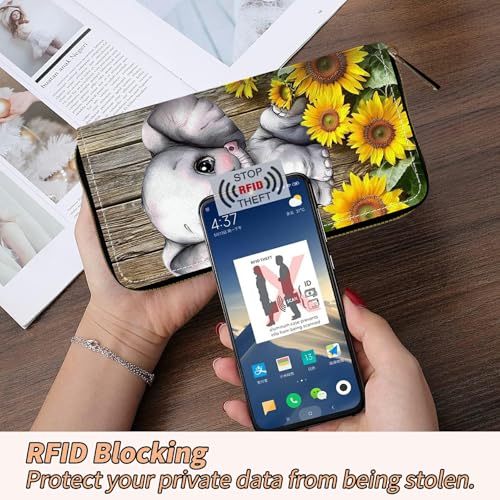 Women's RFID Blocking Wallet PU Leather Slim Bifold Wristlet Clutch with Large Capacity,16 Card Slots & Zipper Coin Purse Pocket Ladies Travel Purse Wristlet,Wooden Sunflowers Elephant