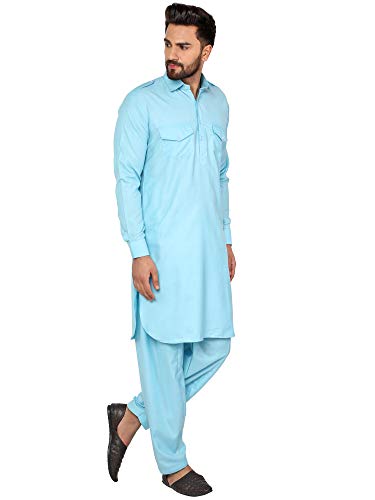• BEAUTIFUL HANDLOOM PATHANI KURTA PAJAMA SET : This is 2-pieces set that includes long button down shirt or kurta and a drawstring pajama. Traditional design on this kurta captures all of the details of the classic Indian men's garment with long sleeves, a long hemline with side vents and a mandarin collar.