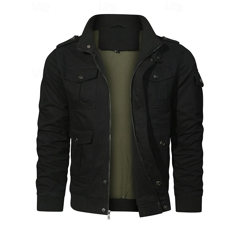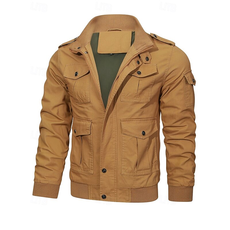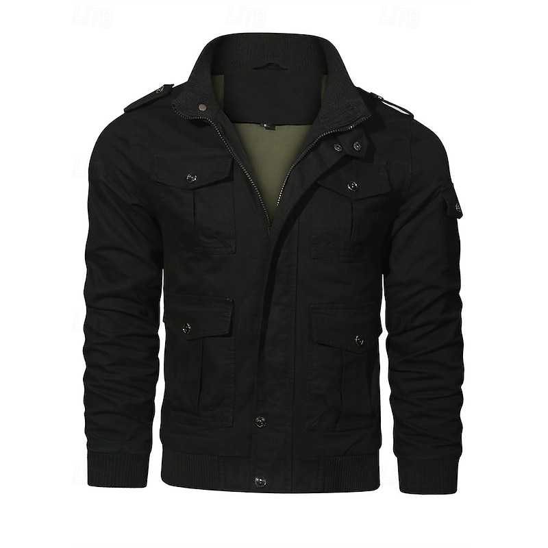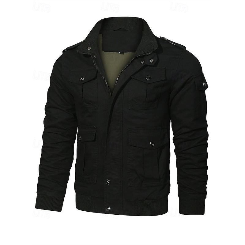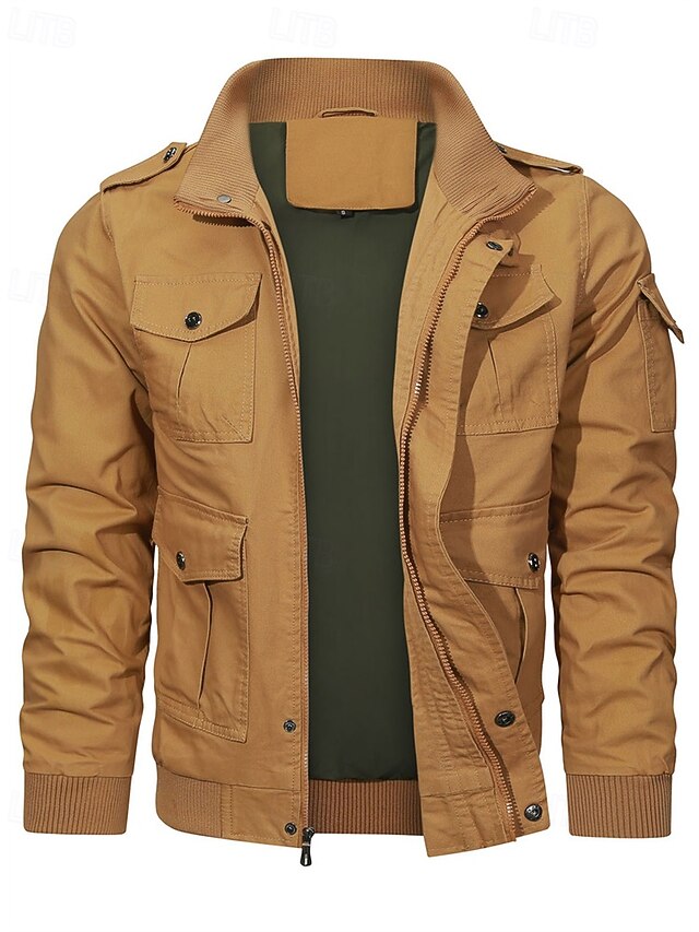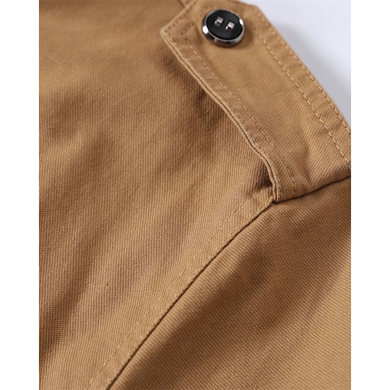 More information about Men's Trucker Jacket Cargo Jacket Casual Jacket Vacation Daily Pocket Spring Fall Plain Fashion Classic Stand Collar Regular Black Khaki Army Green Jacket