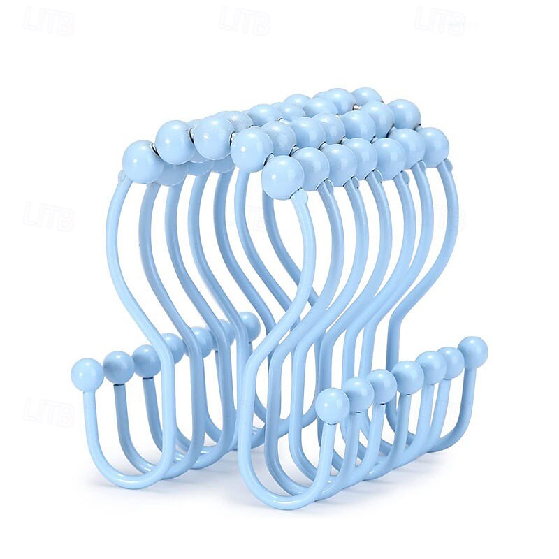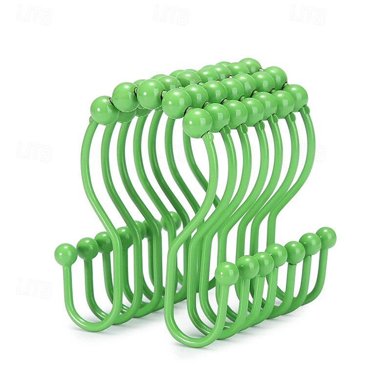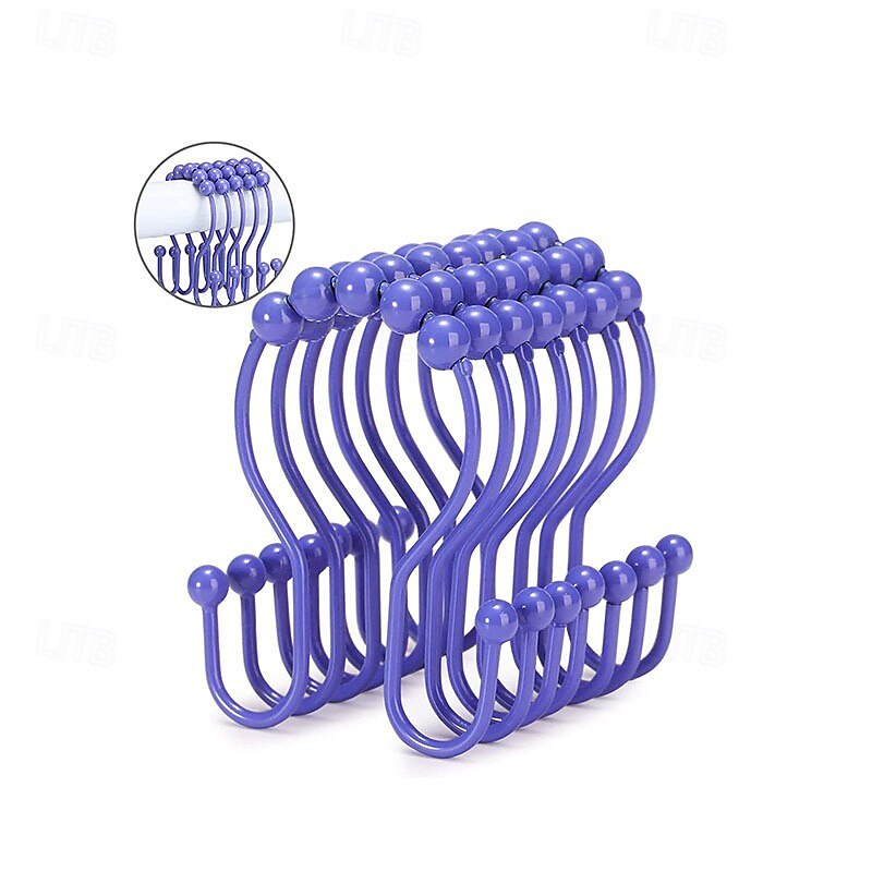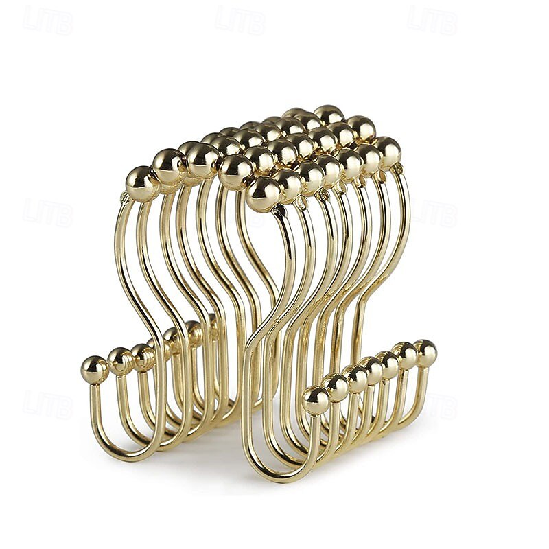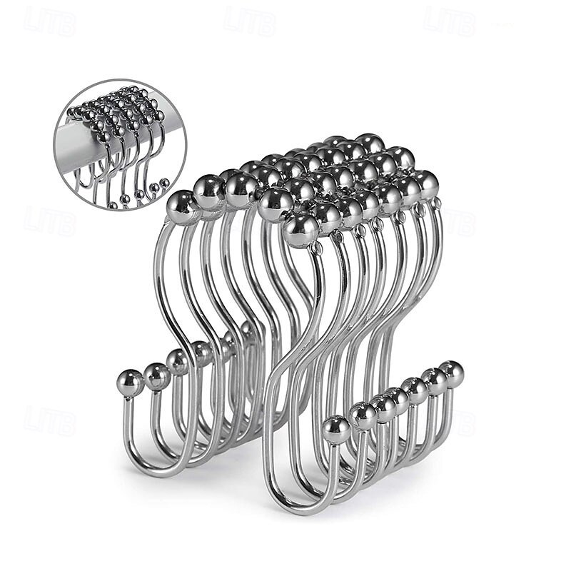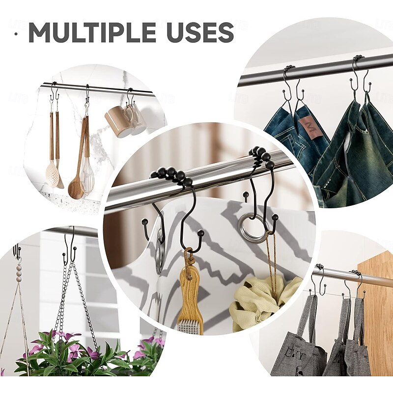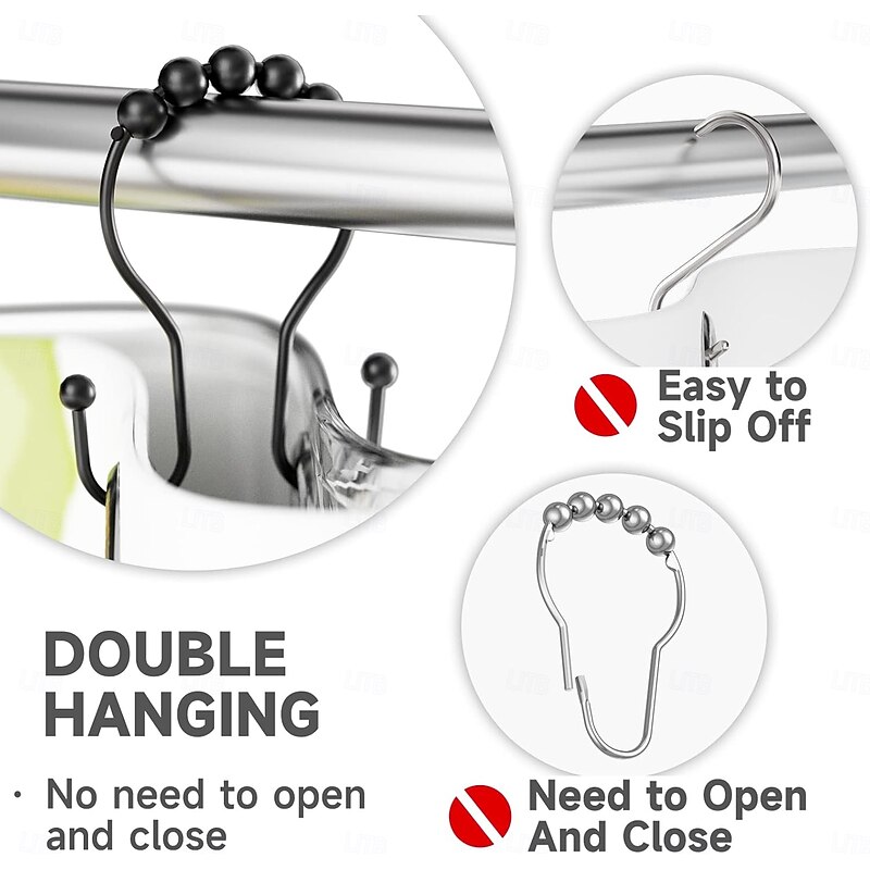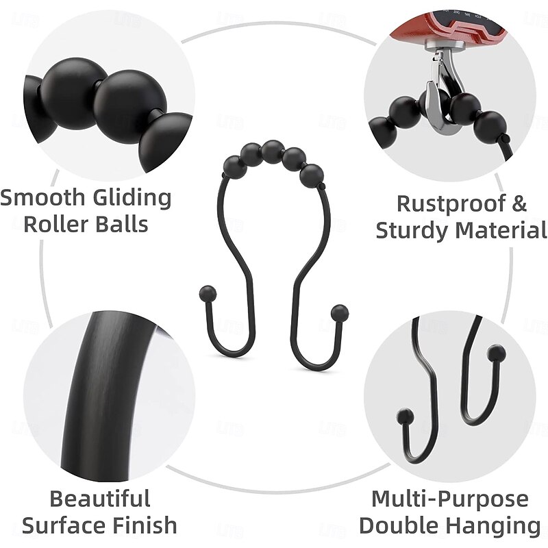 Highlights Double shower hooks for hanging: These shower curtain double hooks have both sides to hang items and keep them balanced. The shower curtain and shower curtain liner can be hung together at the same time and will not fall off easily. Easy installation & removal for cleaning: These shower curtain hooks double sided are easy to install, hang the shower curtain directly and remove it when needed without having to close and open it, friendly to people with insufficient hand strength. Smooth sliding roller balls: These black shower hooks double sided are designed with spherical balls to ensure the shower hooks for shower curtain slide smoothly, reducing friction and avoiding scratches on the shower curtain rod. Premium metal & finish: These double hook shower curtain hooks are made of premium metal, which is strong, and long-lasting. These metal shower curtain hooks rust proof with a beautiful finish that can perfectly match various bathroom curtain. Multi-purpose: In addition to hanging shower curtain and liner, these shower rings for curtain can also support other uses, such as hanging jeans, vests, baseball caps, dual strap purses, kitchen utensils, etc.